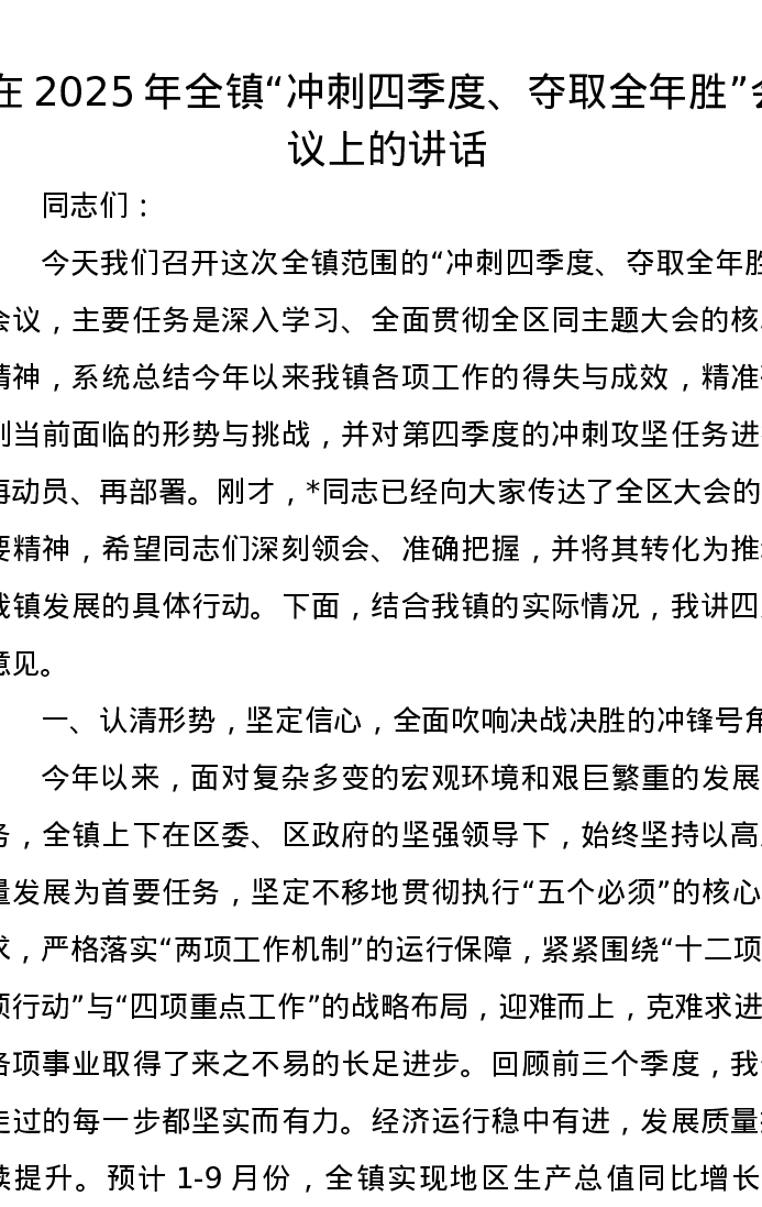 在2025年全镇“冲刺四季度、夺取全年胜”会议上的讲话
