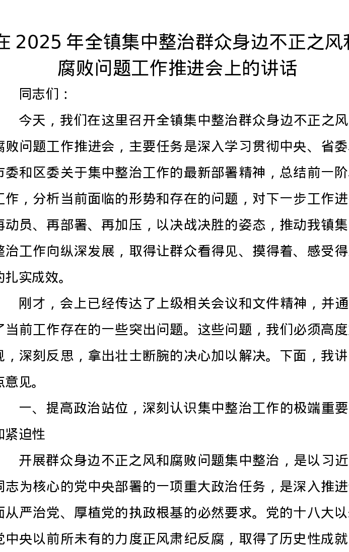 在2025年全镇集中整治群众身边不正之风和腐败问题工作推进会上的讲话