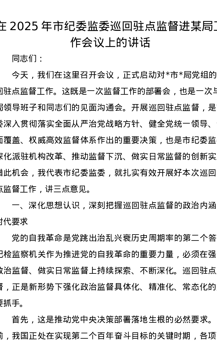 在2025年市纪委监委巡回驻点监督进某局工作会议上的讲话