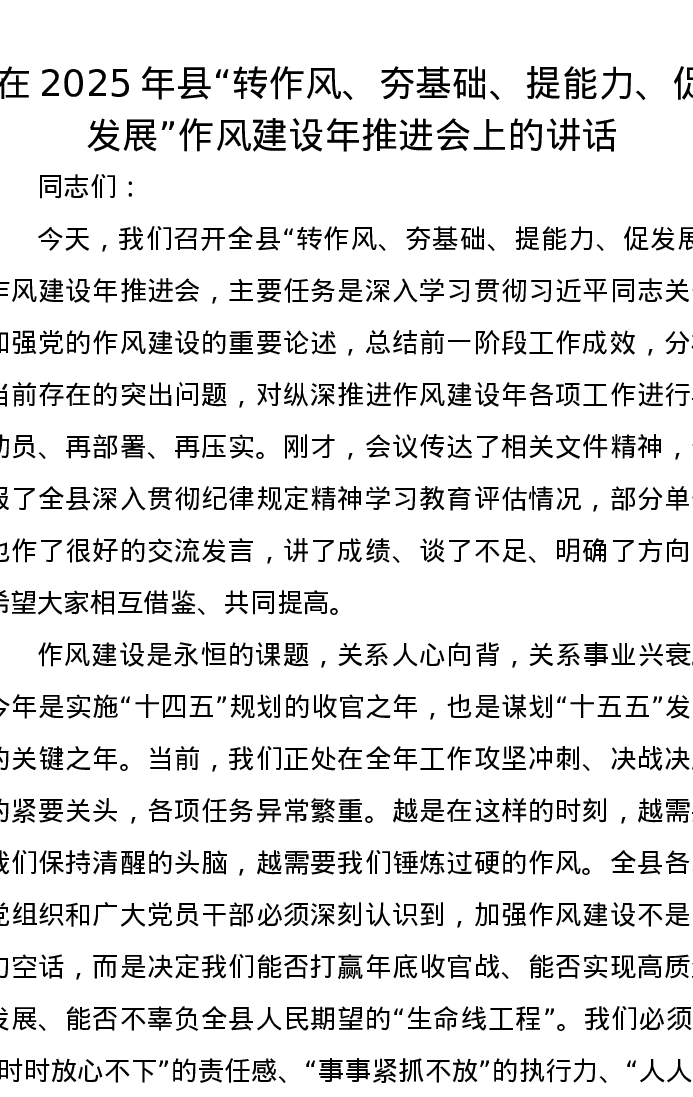 在2025年县“转作风、夯基础、提能力、促发展”作风建设年推进会上的讲话