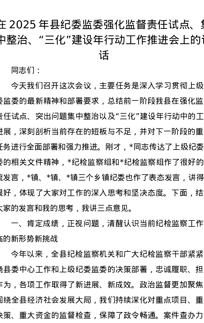 在2025年县纪委监委强化监督责任试点、集中整治、“三化”建设年行动工作推进会上的讲话