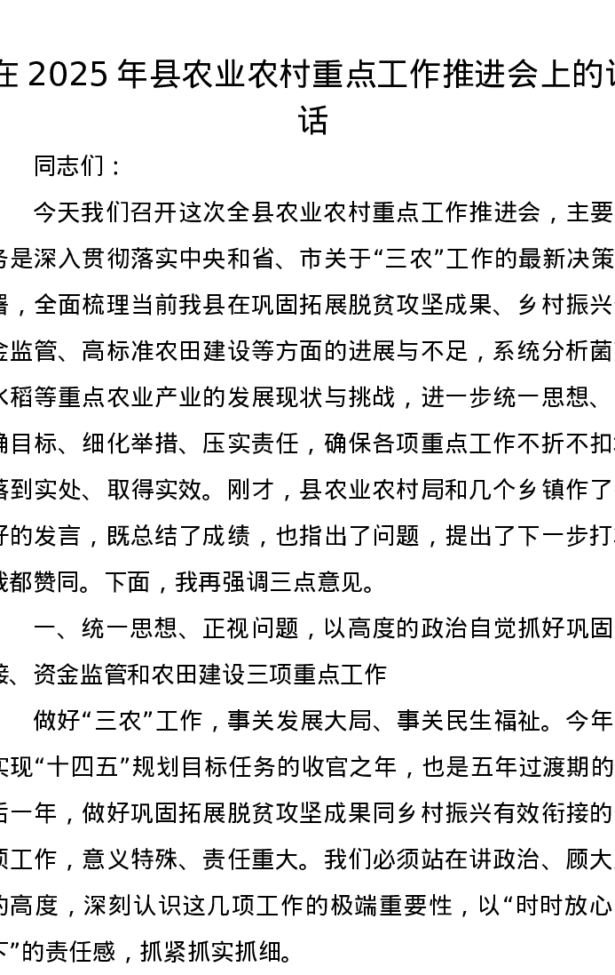 在2025年县农业农村重点工作推进会上的讲话