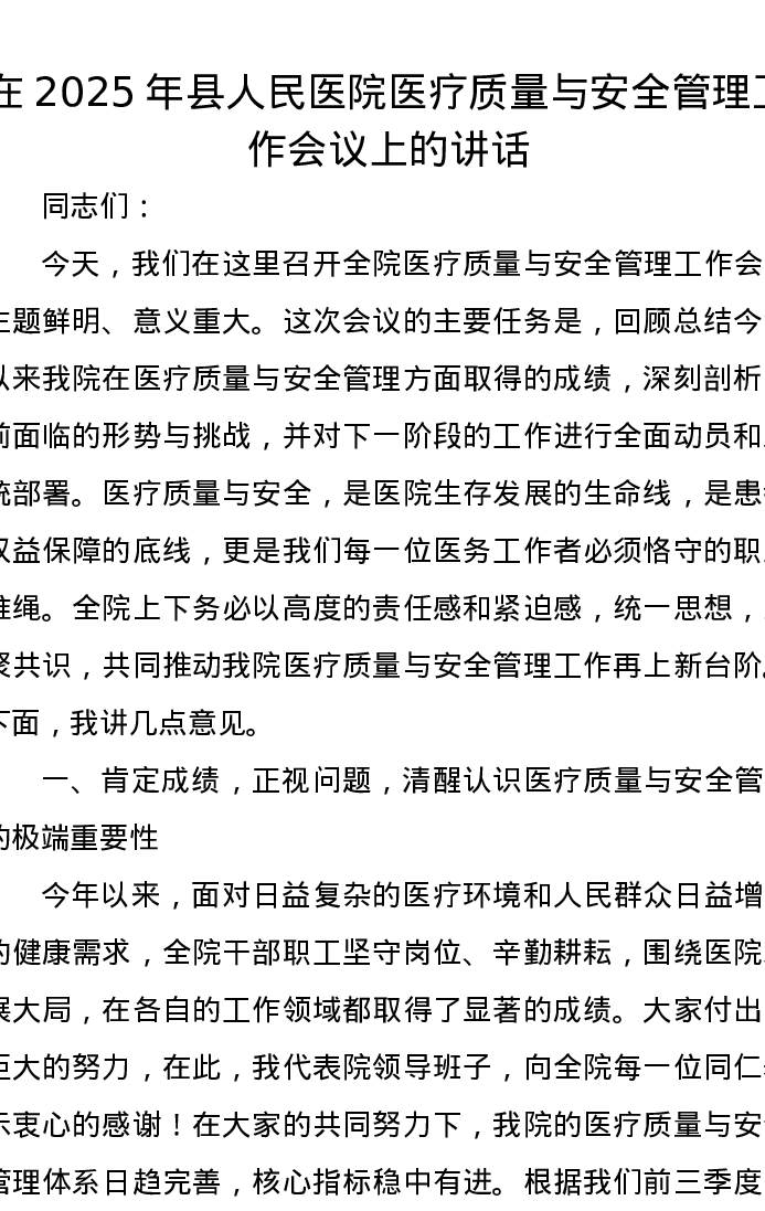 在2025年县人民医院医疗质量与安全管理工作会议上的讲话