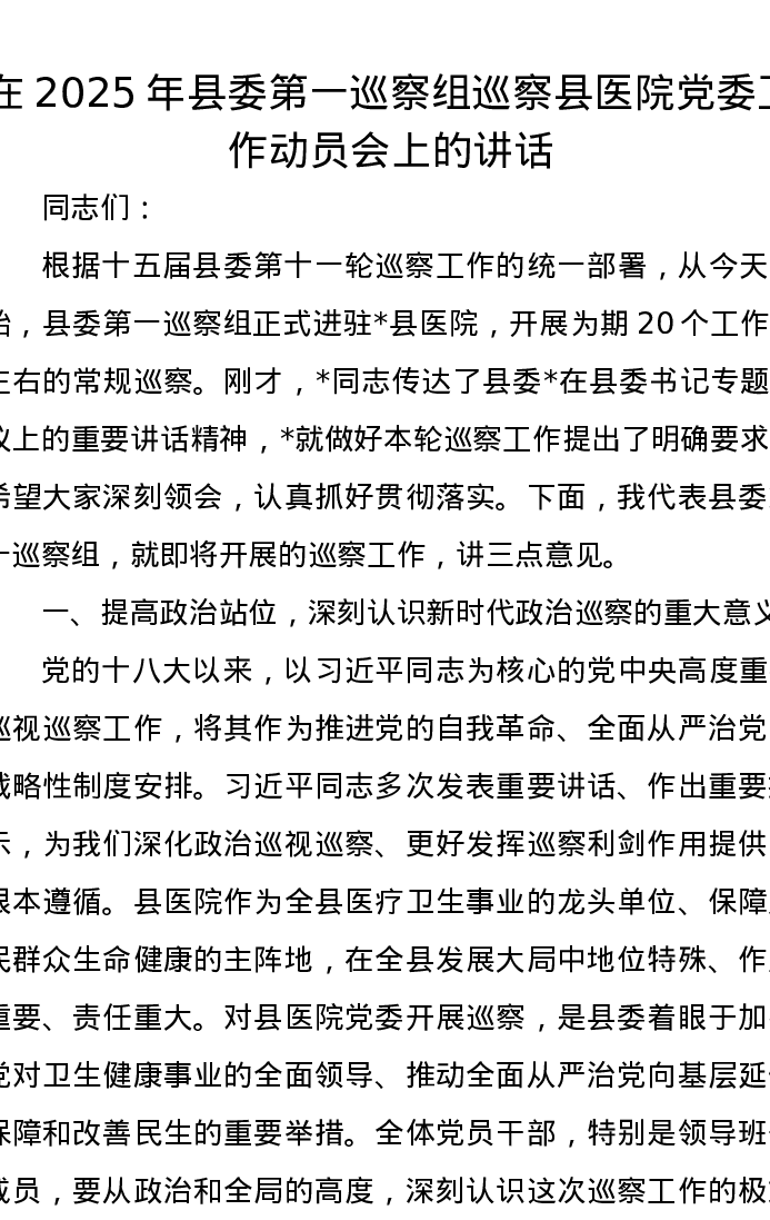 在2025年县委第一巡察组巡察县医院党委工作动员会上的讲话