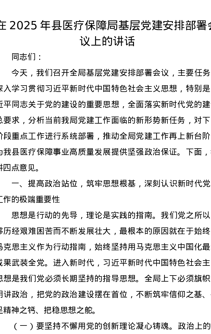 在2025年县医疗保障局基层党建安排部署会议上的讲话