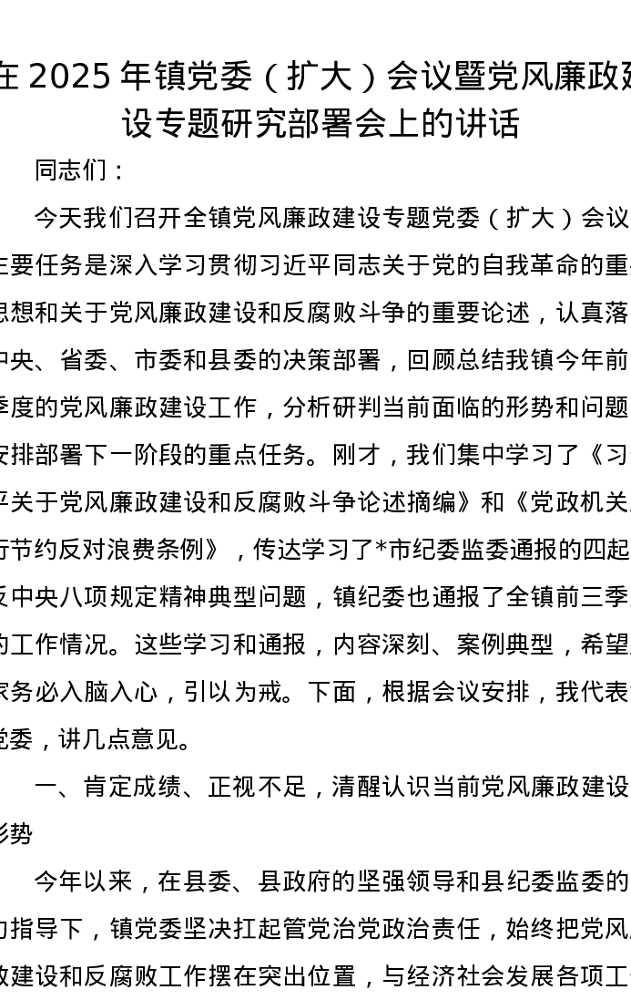 在2025年镇党委(扩大)会议暨党风廉政建设专题研究部署会上的讲话