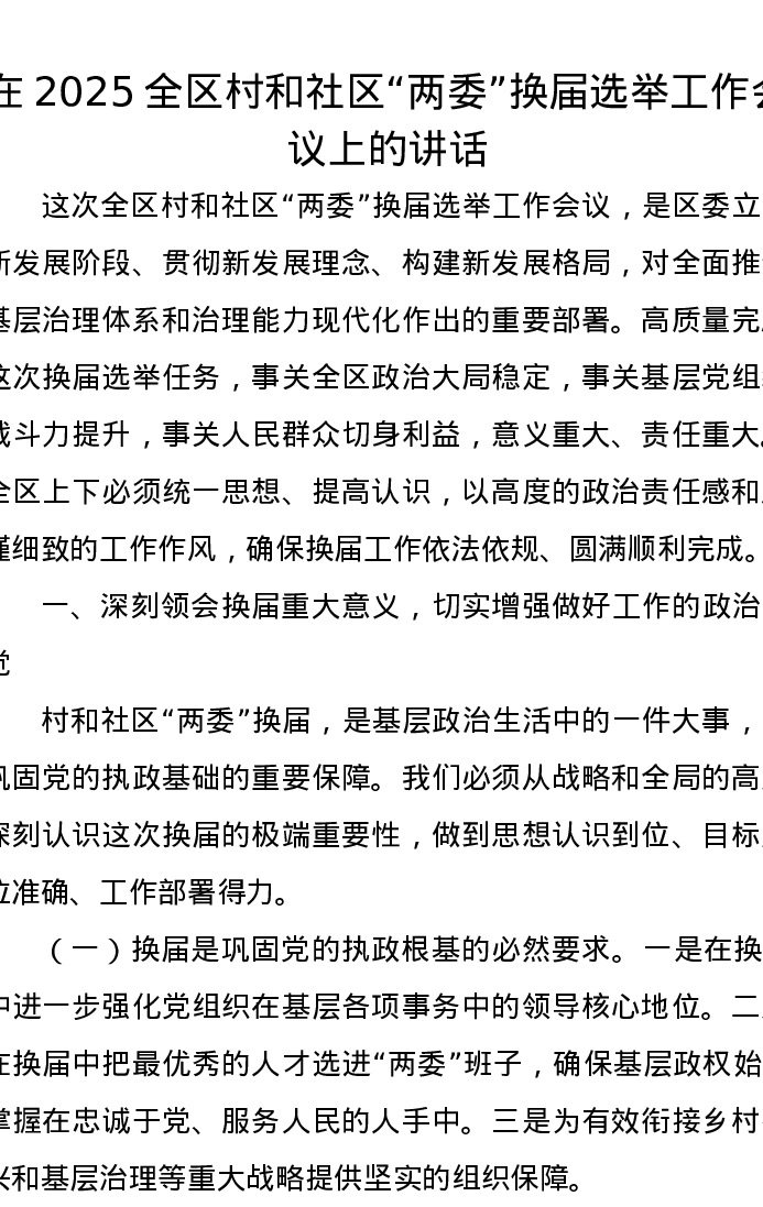 在2025全区村和社区“两委”换届选举工作会议上的讲话