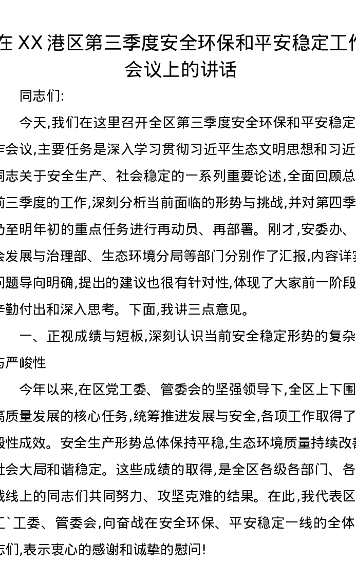 在XX港区第三季度安全环保和平安稳定工作会议上的讲话
