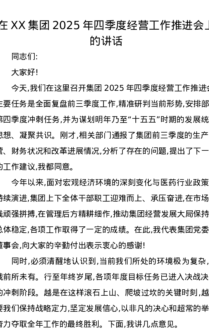 在XX集团2025年四季度经营工作推进会上的讲话