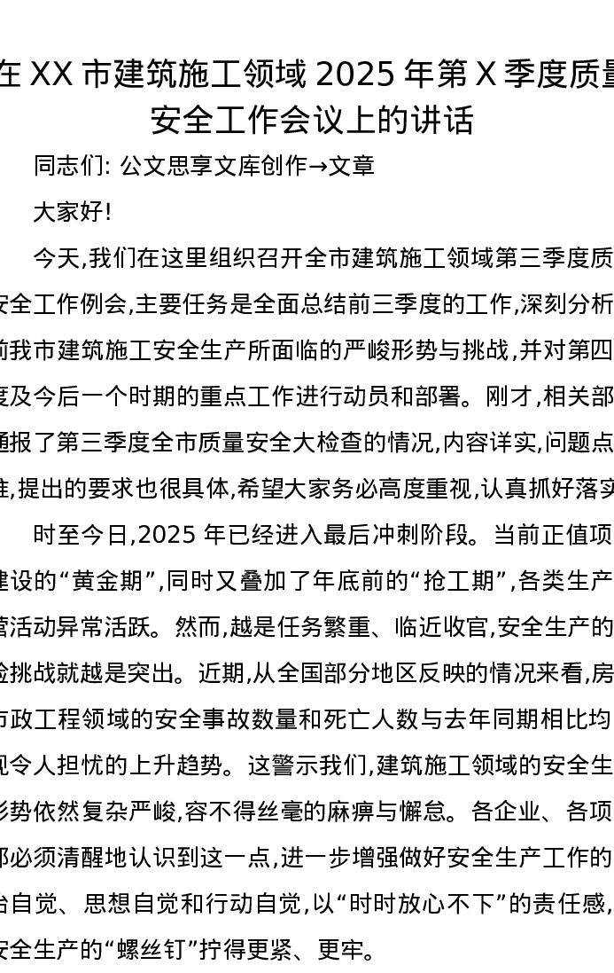 在XX市建筑施工领域2025年第X季度质量安全工作会议上的讲话