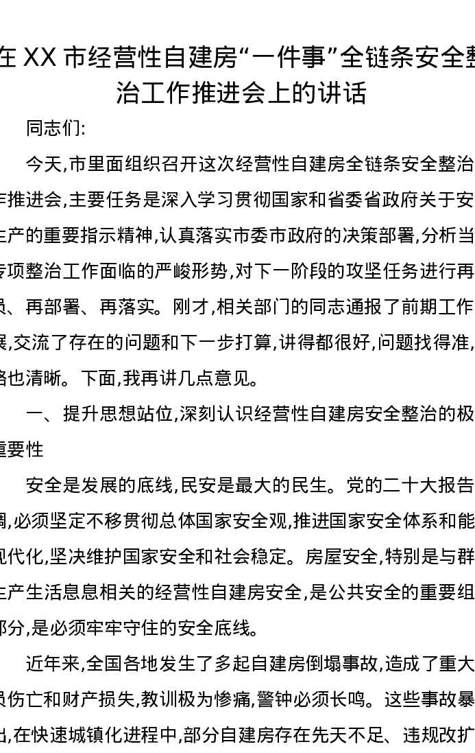 在XX市经营性自建房“一件事”全链条安全整治工作推进会上的讲话
