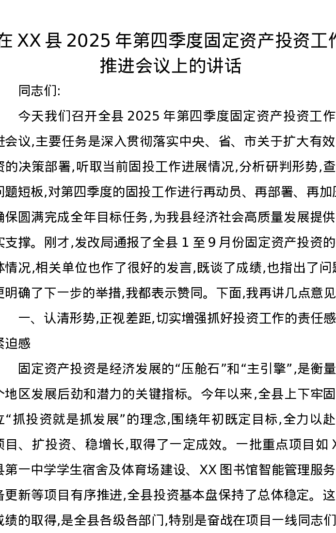 在XX县2025年第四季度固定资产投资工作推进会议上的讲话