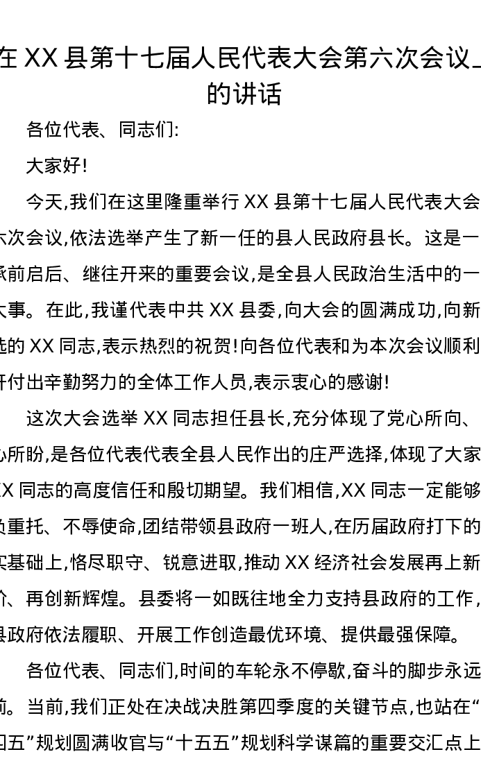 在XX县第十七届人民代表大会第六次会议上的讲话