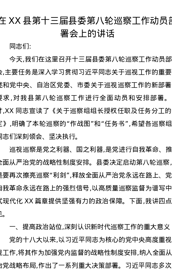 在XX县第十三届县委第八轮巡察工作动员部署会上的讲话