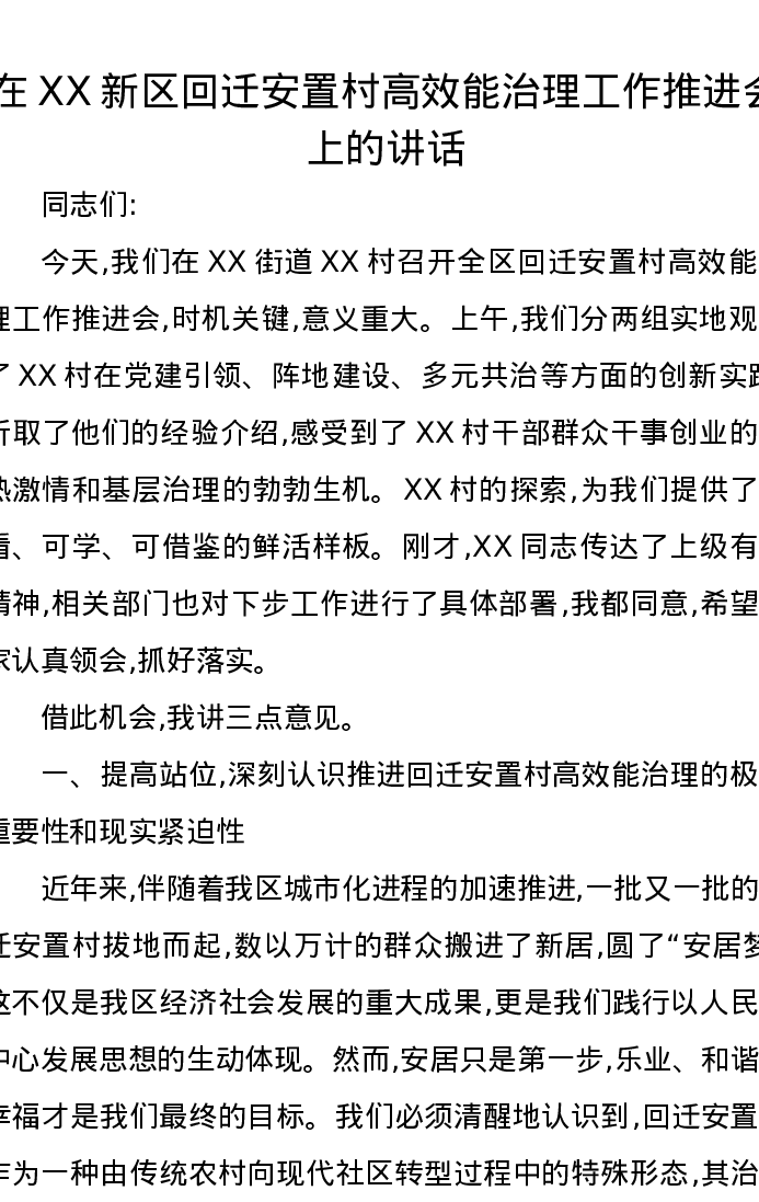 在XX新区回迁安置村高效能治理工作推进会上的讲话