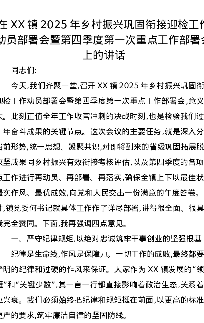 在XX镇2025年乡村振兴巩固衔接迎检工作动员部署会暨第四季度第一次重点工作部署会上的讲话