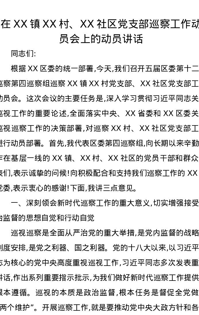 在XX镇XX村、XX社区党支部巡察工作动员会上的动员讲话