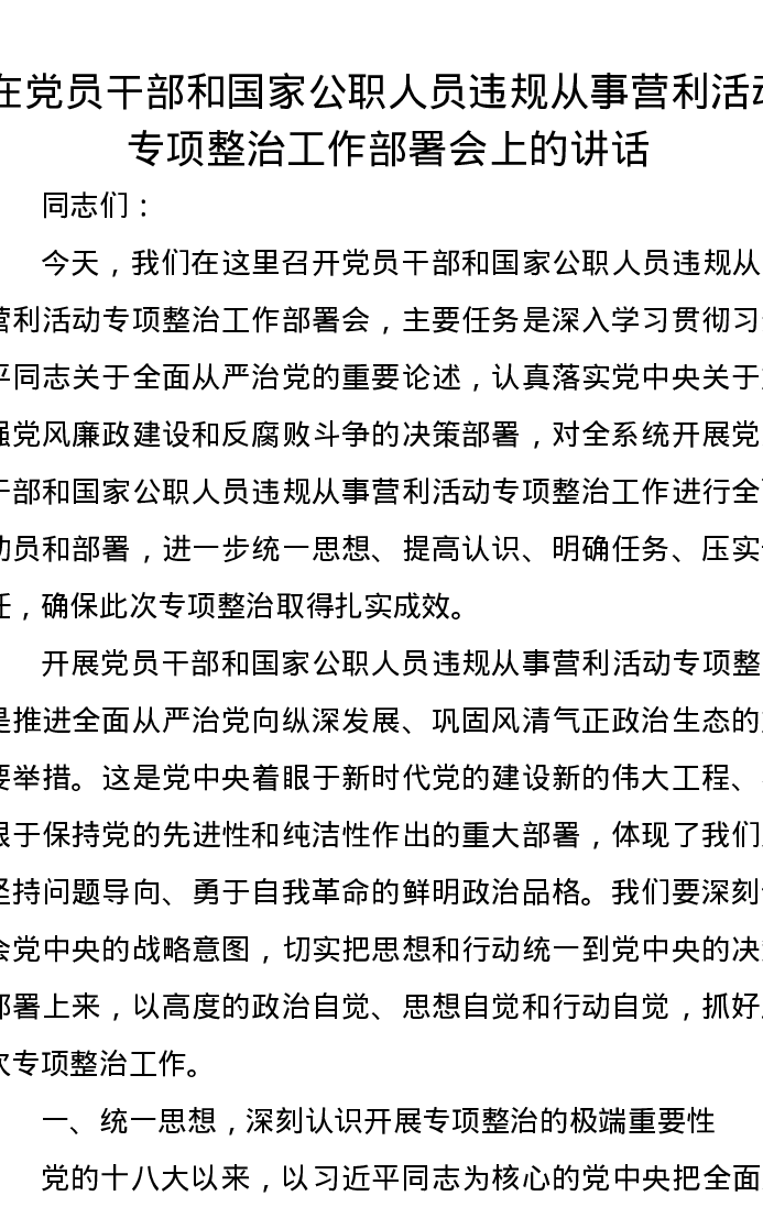 在党员干部和国家公职人员违规从事营利活动专项整治工作部署会上的讲话