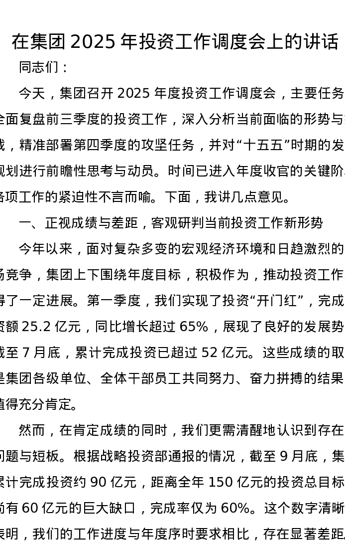 在集团2025年投资工作调度会上的讲话