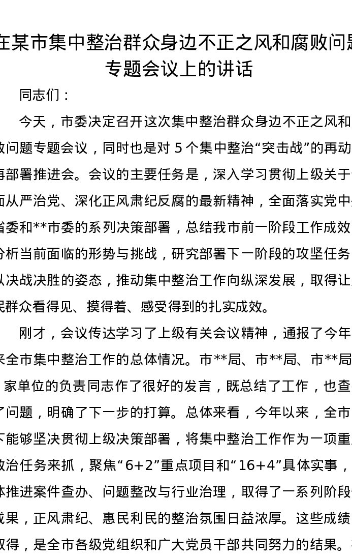 在某市集中整治群众身边不正之风和腐败问题专题会议上的讲话