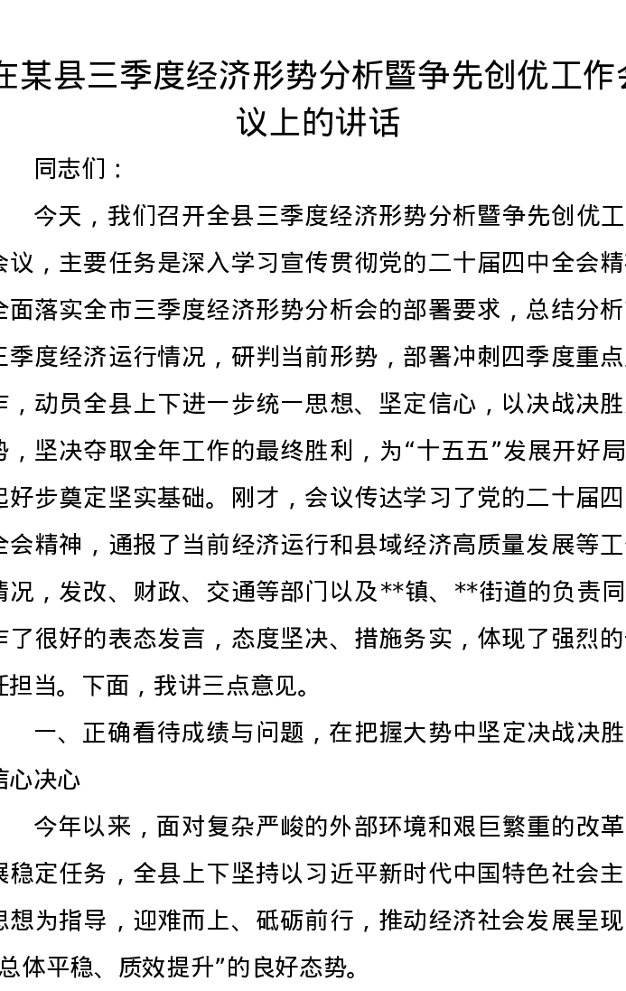 在某县三季度经济形势分析暨争先创优工作会议上的讲话