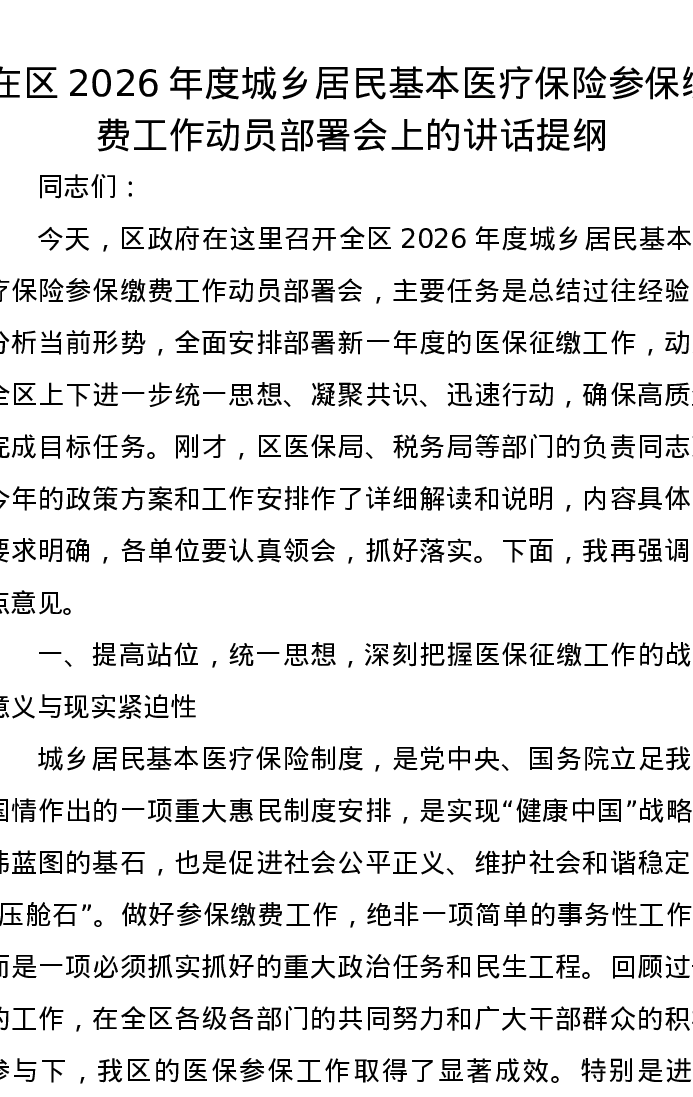 在区2026年度城乡居民基本医疗保险参保缴费工作动员部署会上的讲话提纲