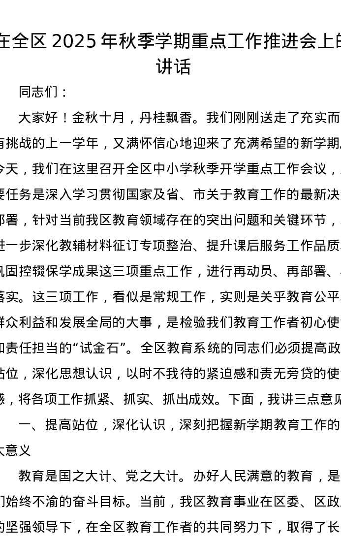 在全区2025年秋季学期重点工作推进会上的讲话