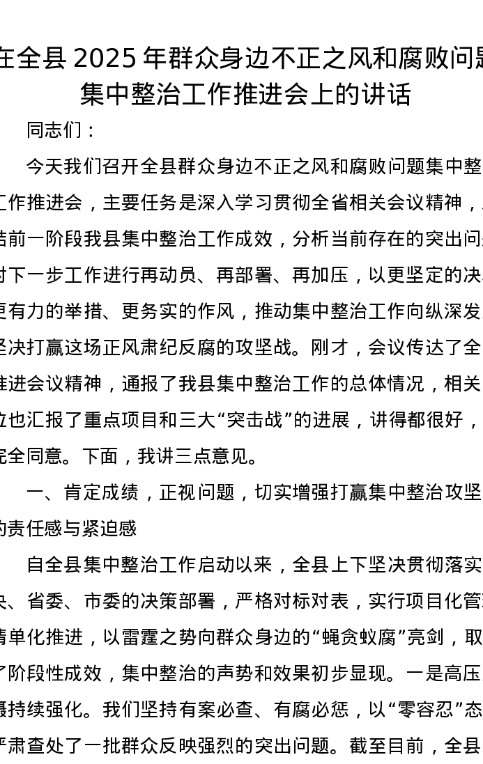 在全县2025年群众身边不正之风和腐败问题集中整治工作推进会上的讲话