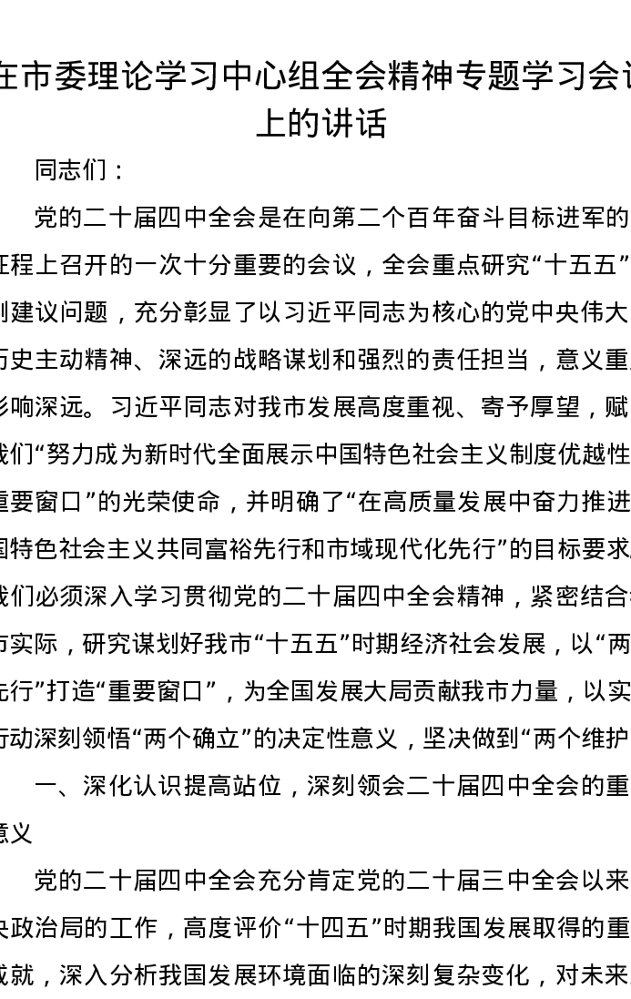 在市委理论学习中心组二十届四中全会精神专题学习会议上的讲话
