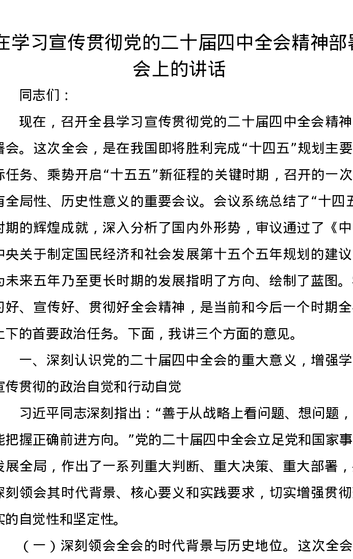 在学习宣传贯彻党的二十届四中全会精神部署会上的讲话
