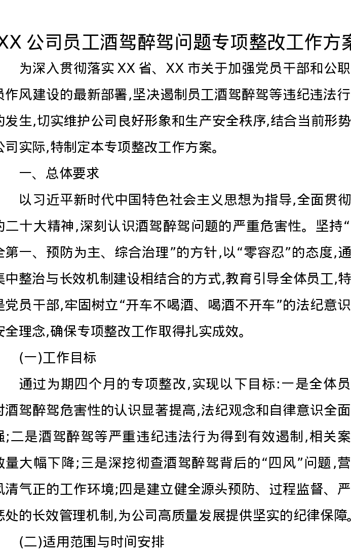 XX公司员工酒驾醉驾问题专项整改工作方案
