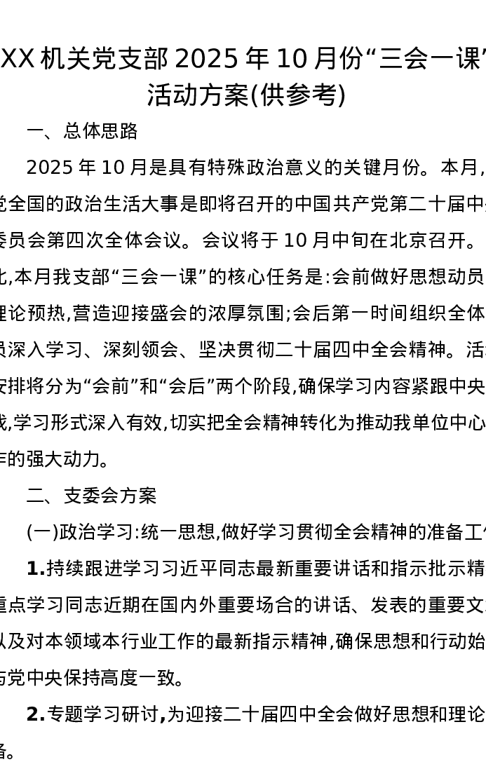 XX机关党支部2025年10月份“三会一课”活动方案(供参考)