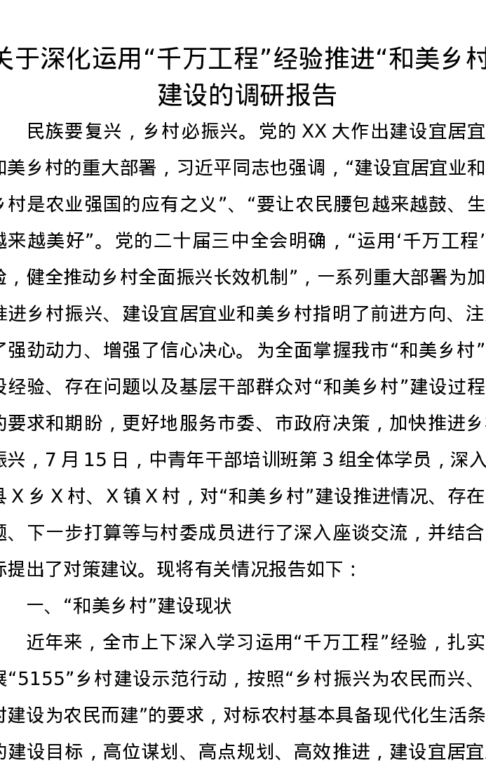 关于深化运用“千万工程”经验推进“和美乡村”建设的调研报告