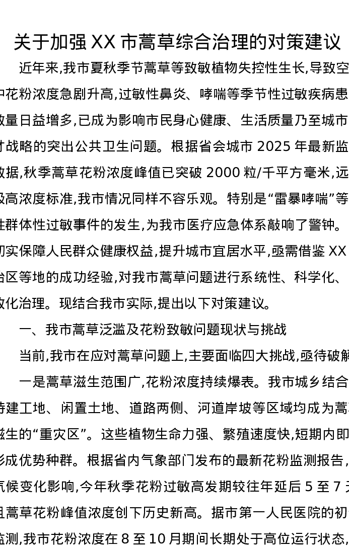 调研报告:关于加强XX市蒿草综合治理的对策建议