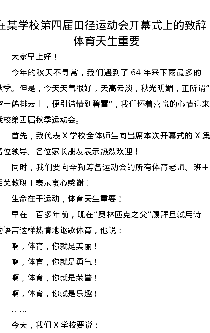 在某学校第四届田径运动会开幕式上的致辞:体育天生重要