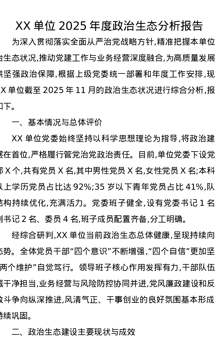 XX单位2025年度政治生态分析报告