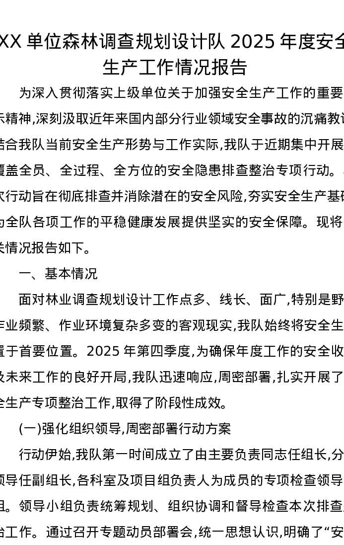 XX单位森林调查规划设计队2025年度安全生产工作情况报告