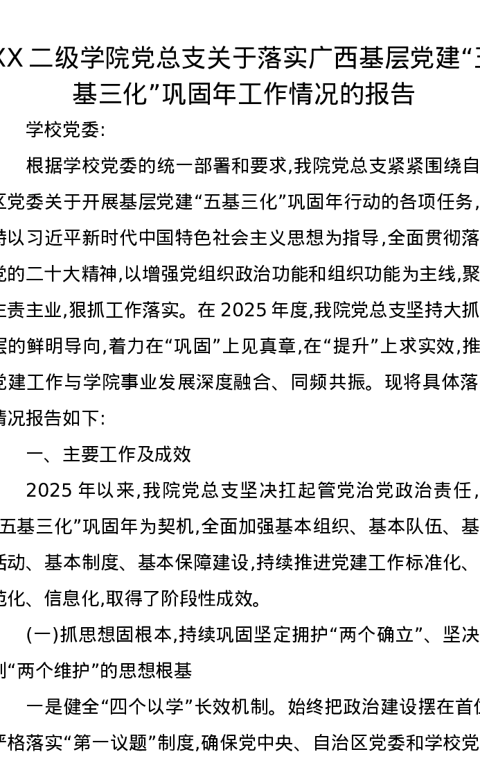 XX二级学院党总支关于落实广西基层党建“五基三化”巩固年工作情况的报告