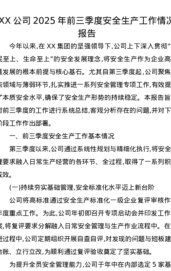 XX公司2025年前三季度安全生产工作情况报告