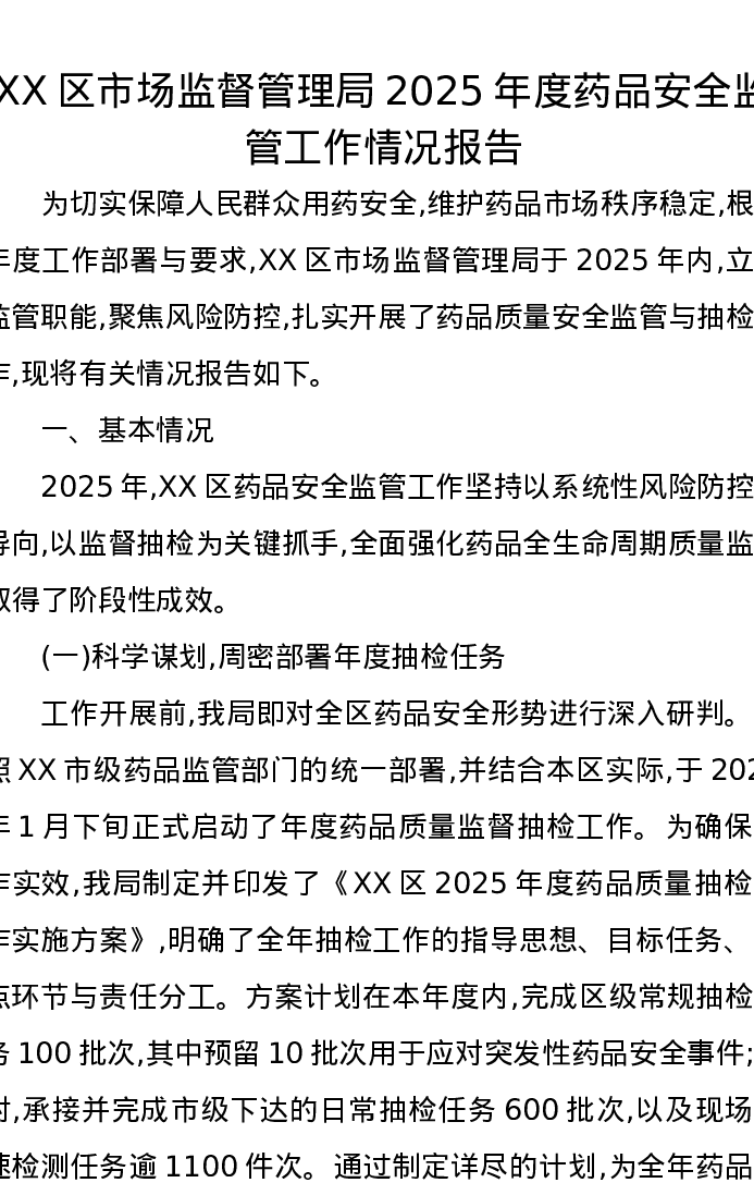 XX区市场监督管理局2025年度药品安全监管工作情况报告