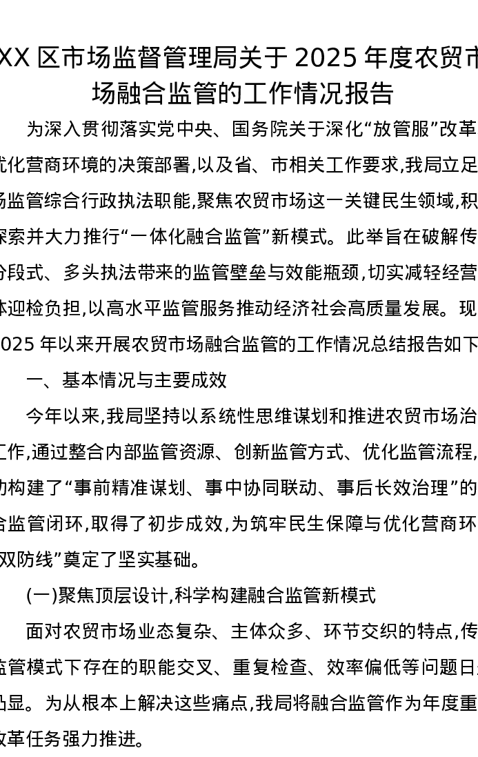 XX区市场监督管理局关于2025年度农贸市场融合监管的工作情况报告