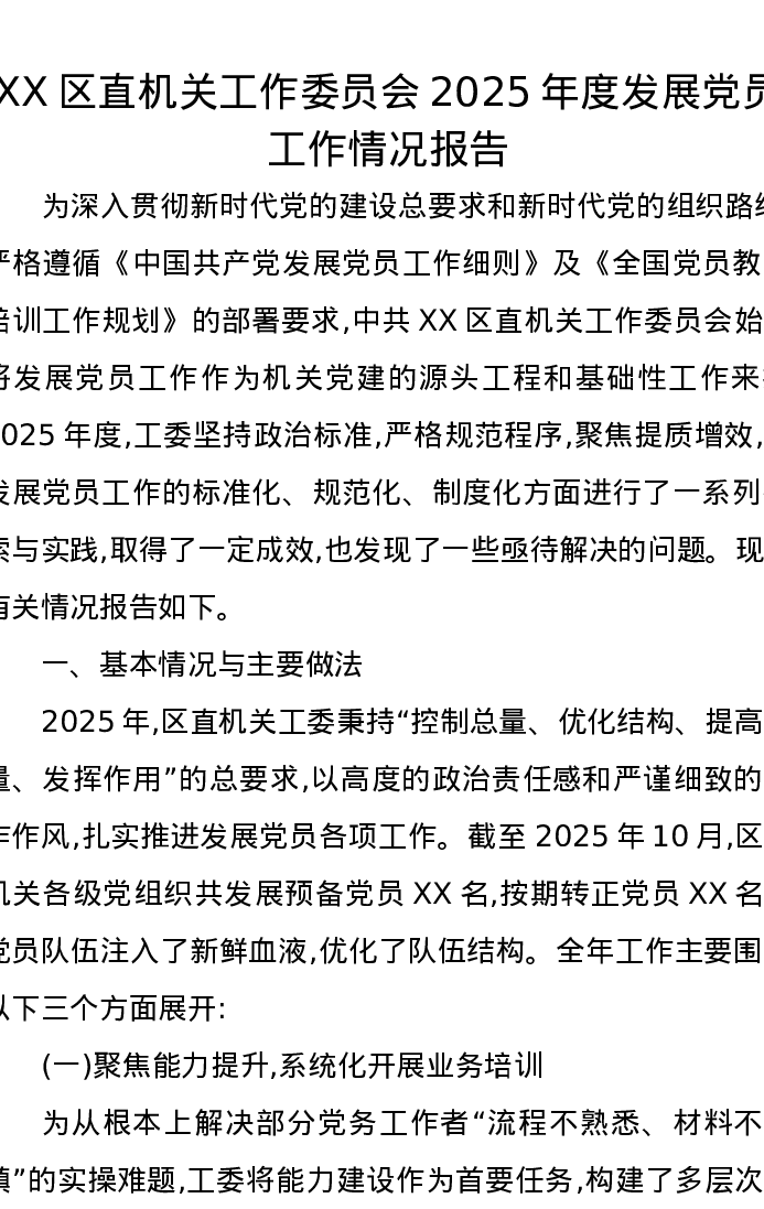 XX区直机关工作委员会2025年度发展党员工作情况报告
