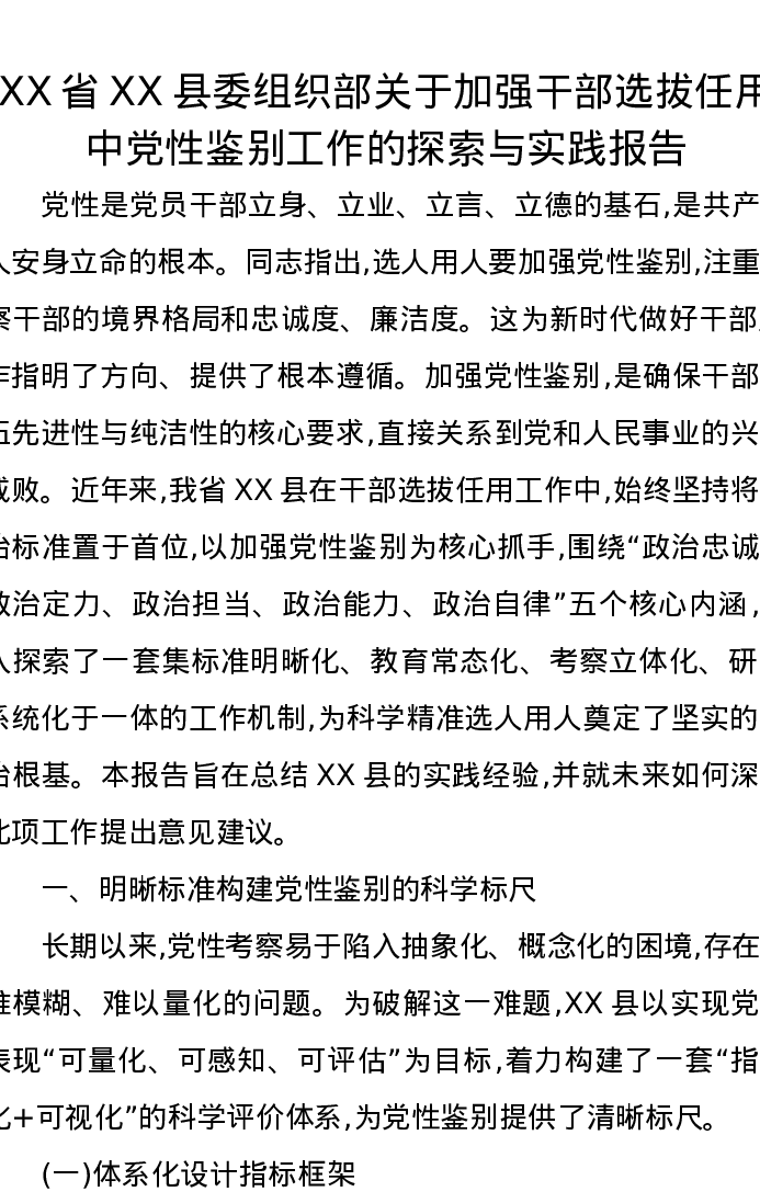 XX省XX县委组织部关于加强干部选拔任用中党性鉴别工作的探索与实践报告
