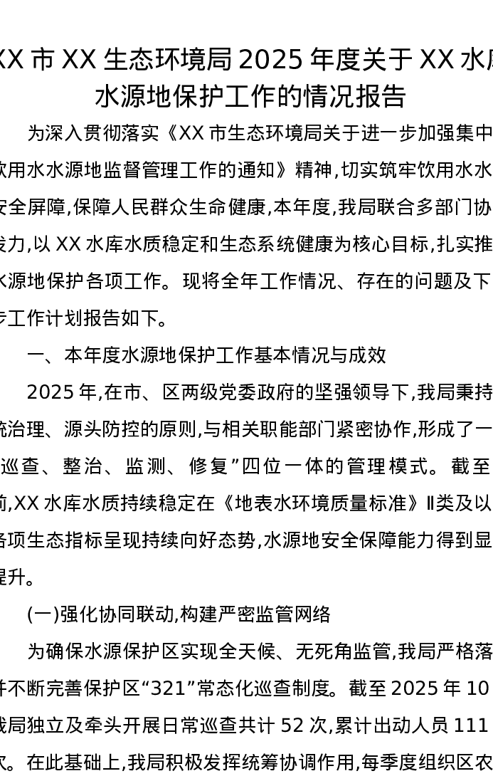 XX市XX生态环境局2025年度关于XX水库水源地保护工作的情况报告