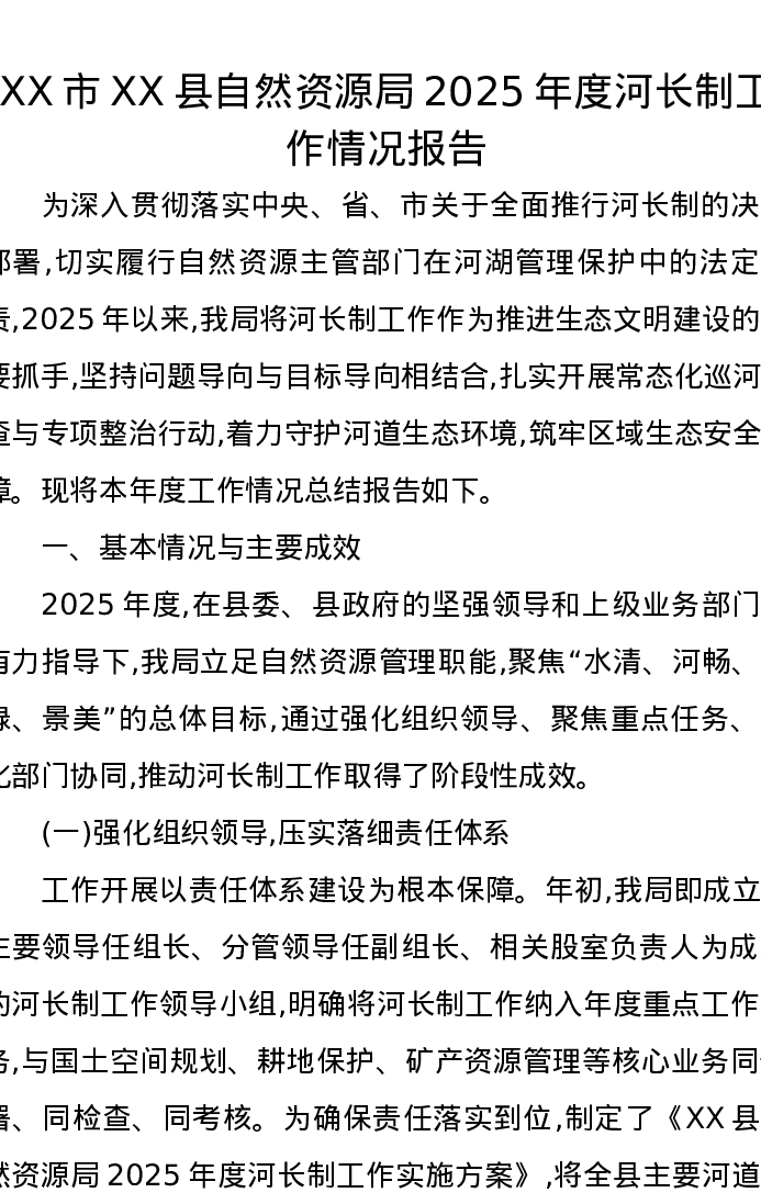 XX市XX县自然资源局2025年度河长制工作情况报告