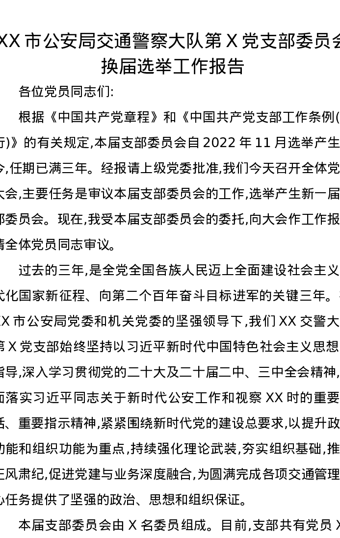 XX市公安局交通警察大队第X党支部委员会换届选举工作报告