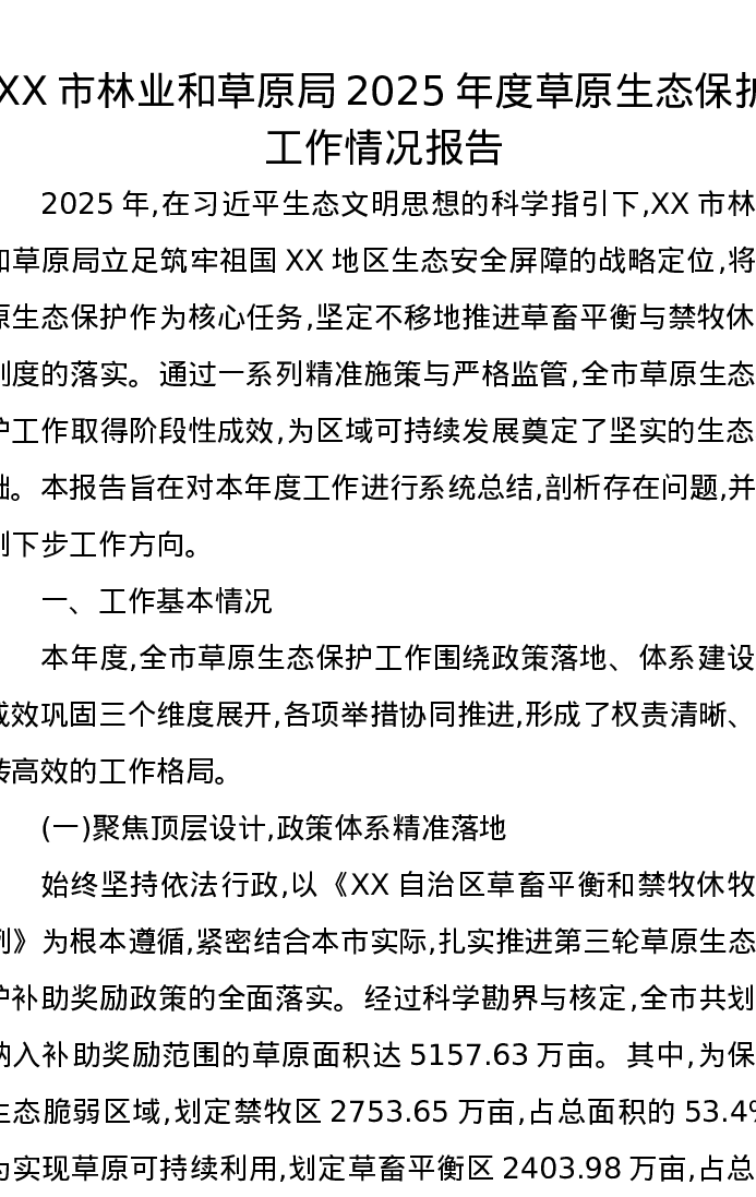 XX市林业和草原局2025年度草原生态保护工作情况报告