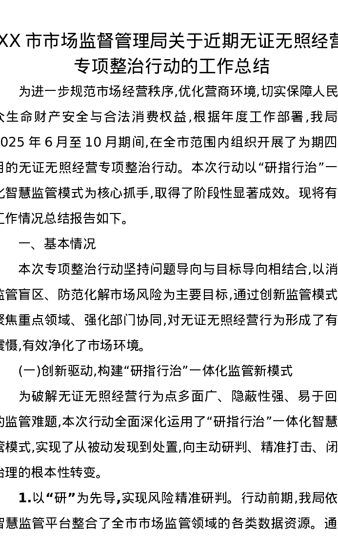 XX市市场监督管理局关于近期无证无照经营专项整治行动的工作总结