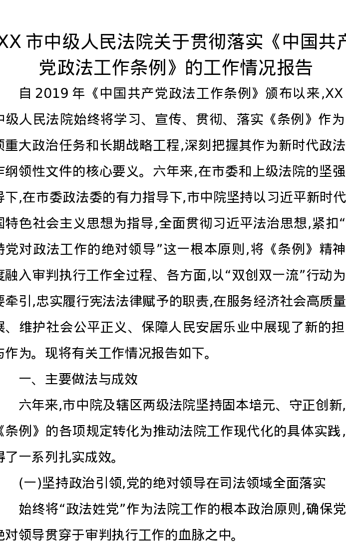 XX市中级人民法院关于贯彻落实《中国共产党政法工作条例》的工作情况报告