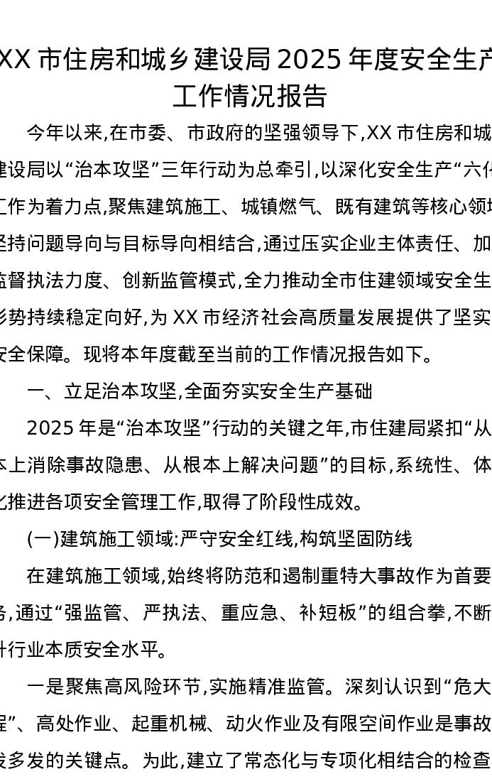 XX市住房和城乡建设局2025年度安全生产工作情况报告
